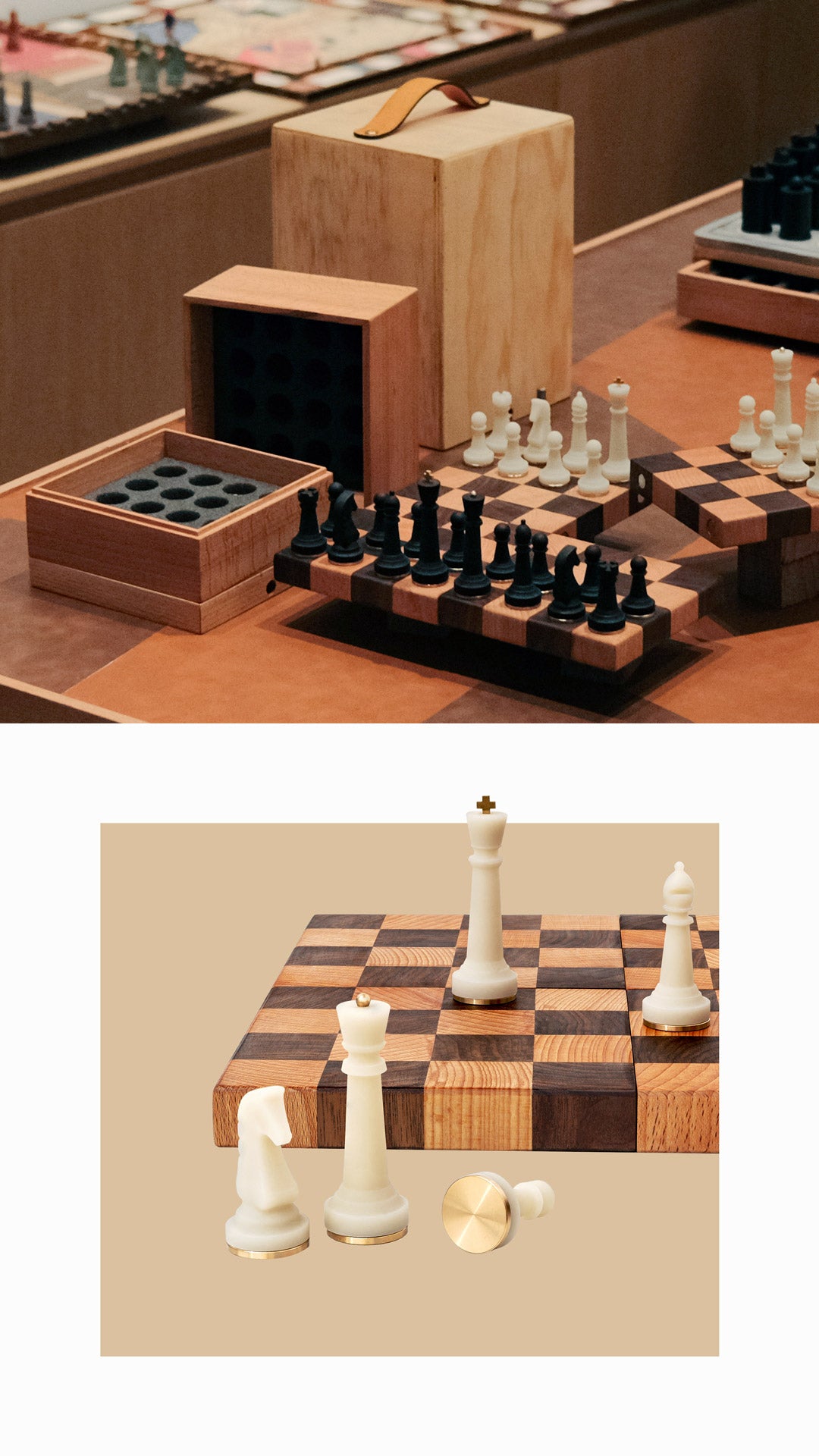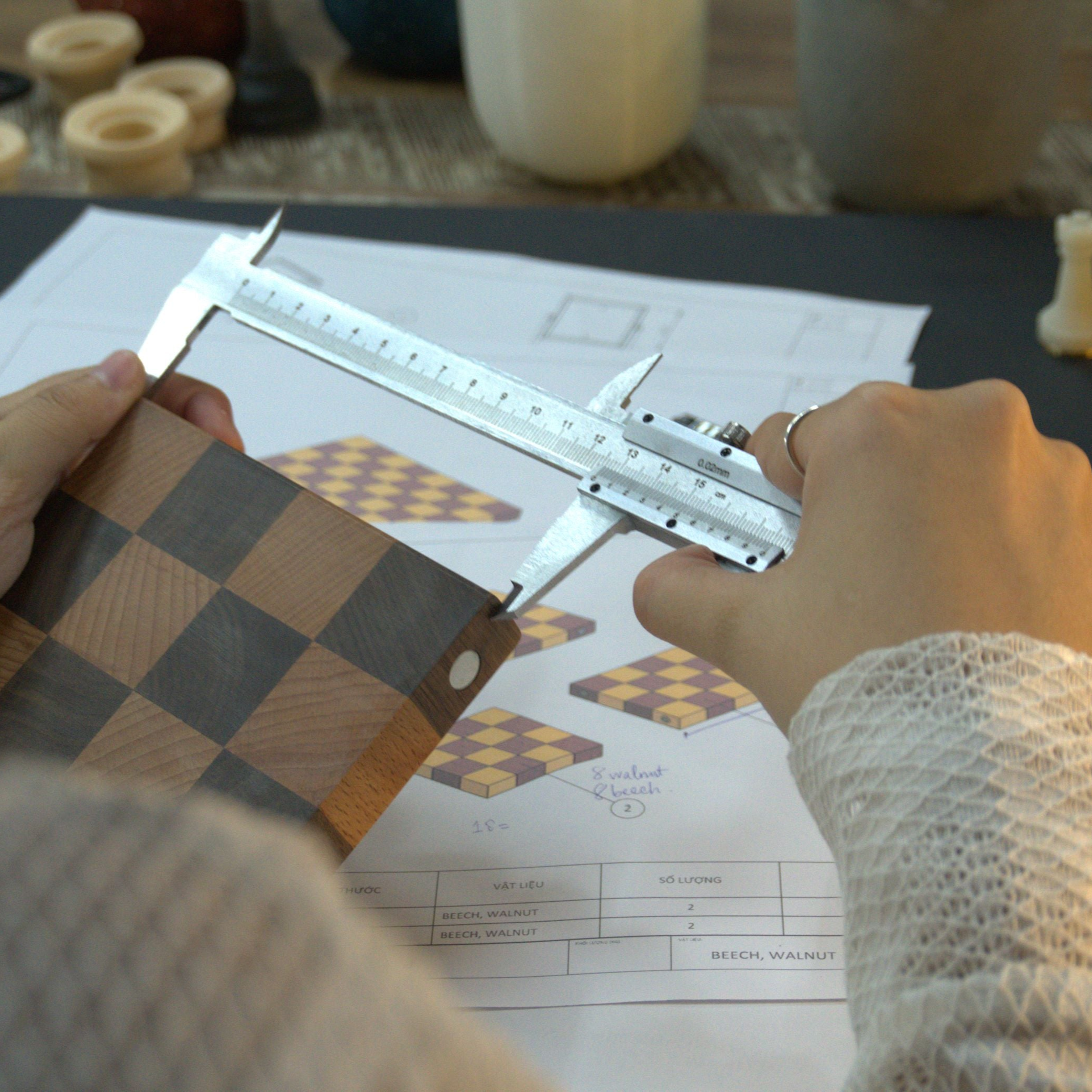 Quá trình chọn lọc chất liệu đảm bảo sự đồng nhất trong sắc độ của gỗ walnut và gỗ beech, tạo ra một bàn cờ thấm đượm nghệ thuật chế tác thủ công tinh xảo với những khối gỗ vuông được dán xen kẽ với nhau một cách chính xác. Các cạnh và bề mặt của bàn cờ được chà nhám tỉ mỉ nhằm mang đến một trải nghiệm chơi liền mạch và an toàn. Bên cạnh đó, nam châm được tích hợp bên trong cho phép người chơi dễ dàng tháo rời bàn cờ thành bốn mảnh riêng biệt, với mỗi bề mặt viền được đánh số hỗ trợ việc sắp xếp bàn chơi tương ứng.