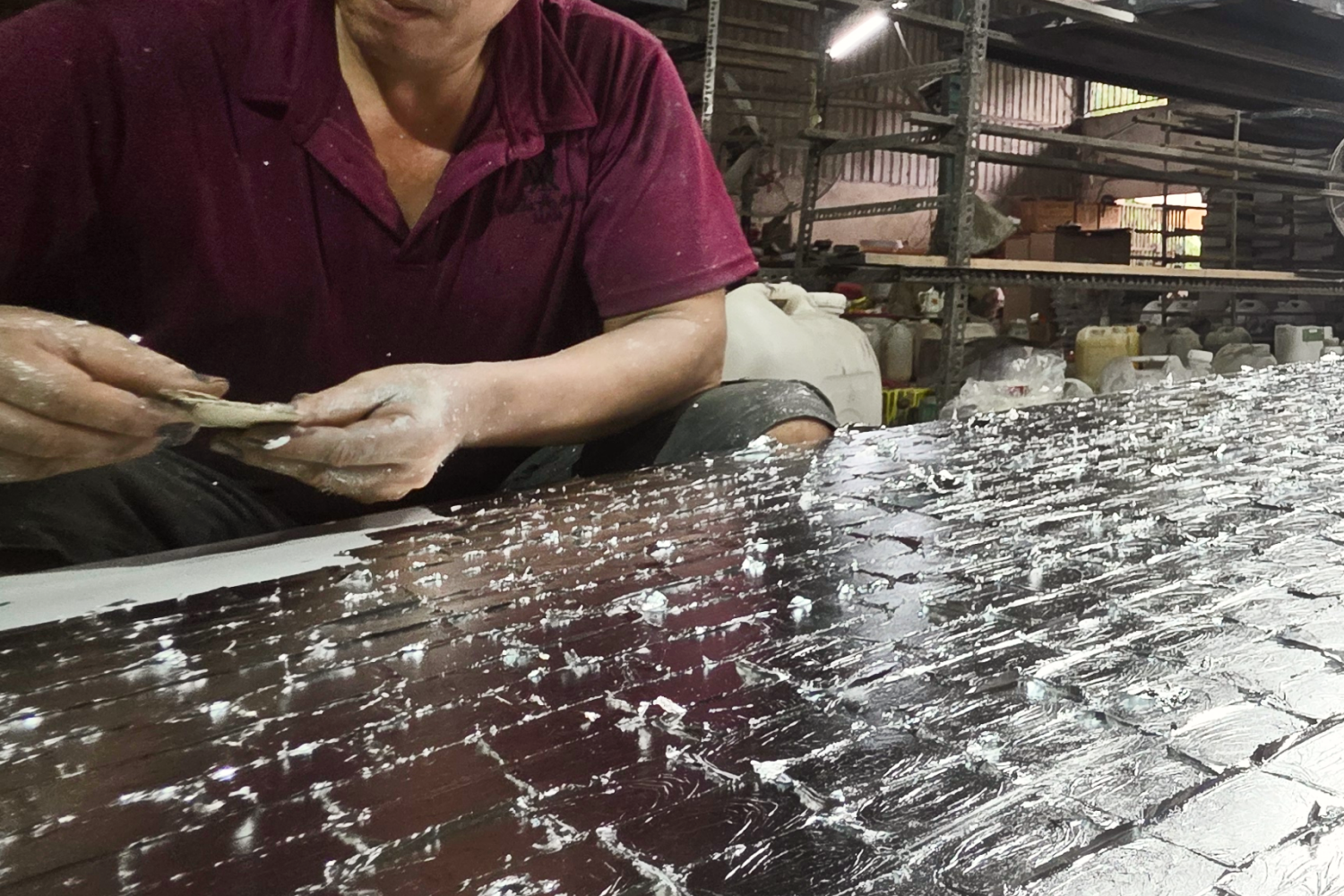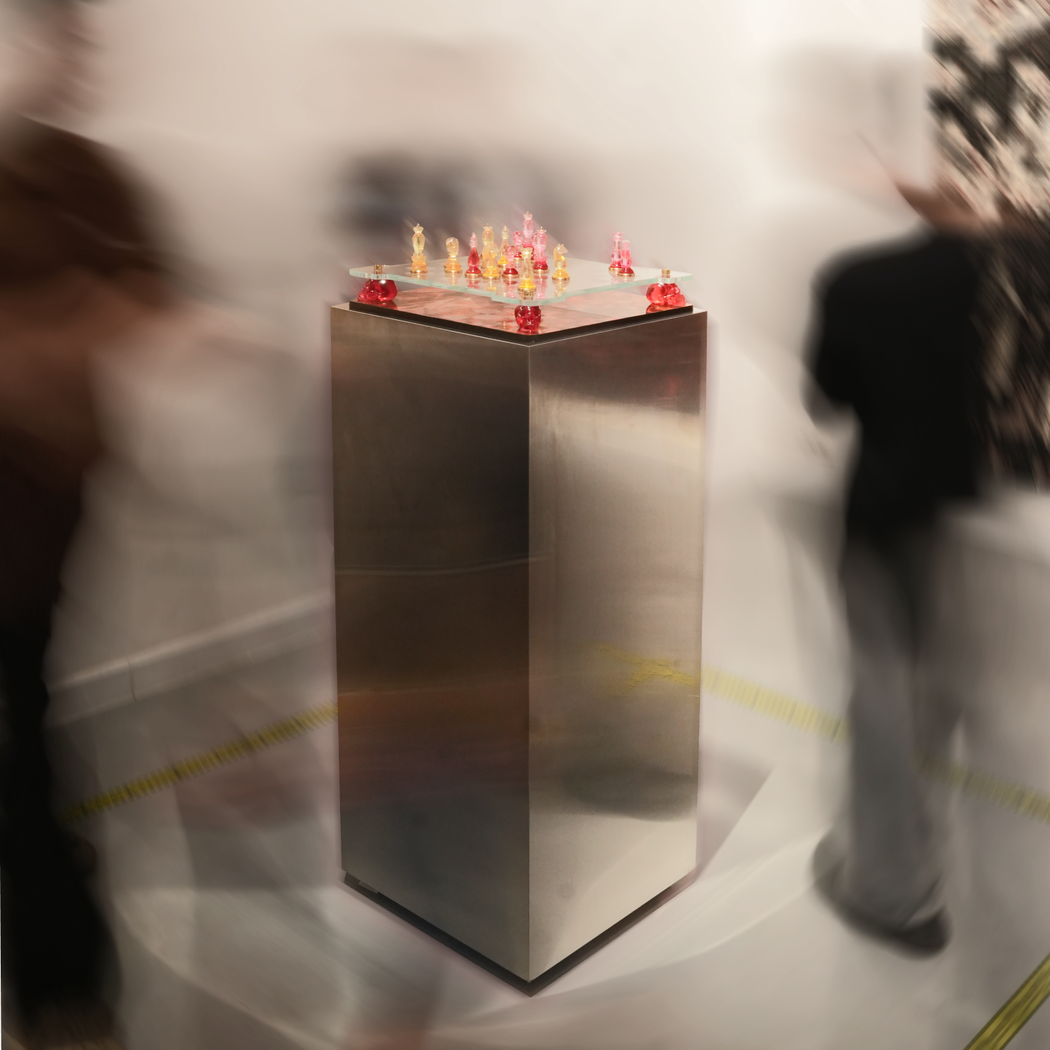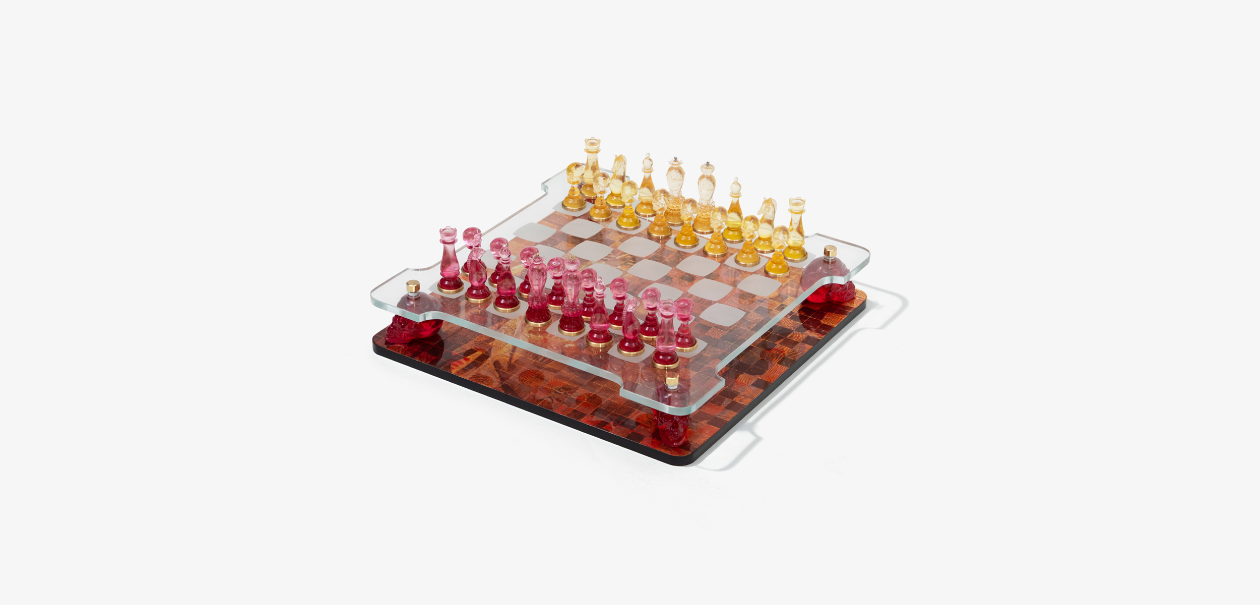- Bàn cờ được thiết kế theo cấu trúc 2 tầng, với mặt gỗ sơn mài sử dụng kỹ thuật thếp bạc và in phun UV, kết hợp kính cường lực ở tầng trên. Toàn bộ kết cấu được nâng đỡ bởi các chân đế đầu lâu bằng resin trong, nắp đồng giúp tổng thể trở thành một điểm nhấn trưng bày đầy ấn tượng.